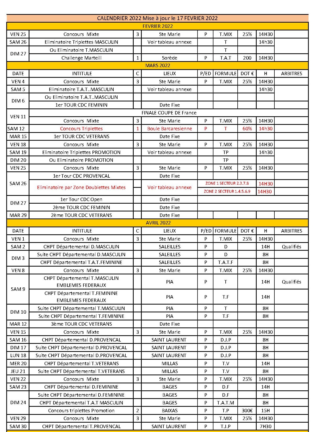Mise à jour calendrier au 15 juin 2022